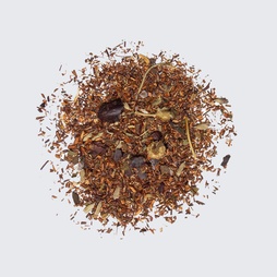 Rooibos, cranberries, coconut, vanilla, cocoa nibs, rose hips, anise seed, fennel seed, cocoa powder, monk fruit sweetener, maca powder, cardamom powder, cinnamon powder, ginger powder, nutmeg powder, rose bud & petals, pomegranate vanilla extract, safflower.